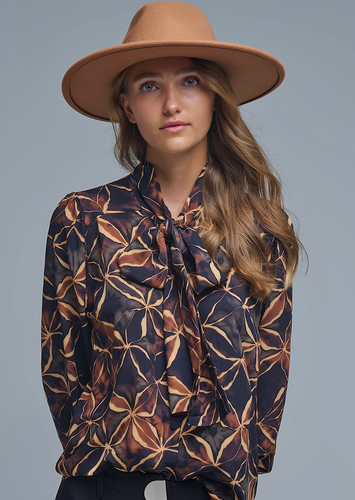 Abstract print bow blouse - Blk / Rust