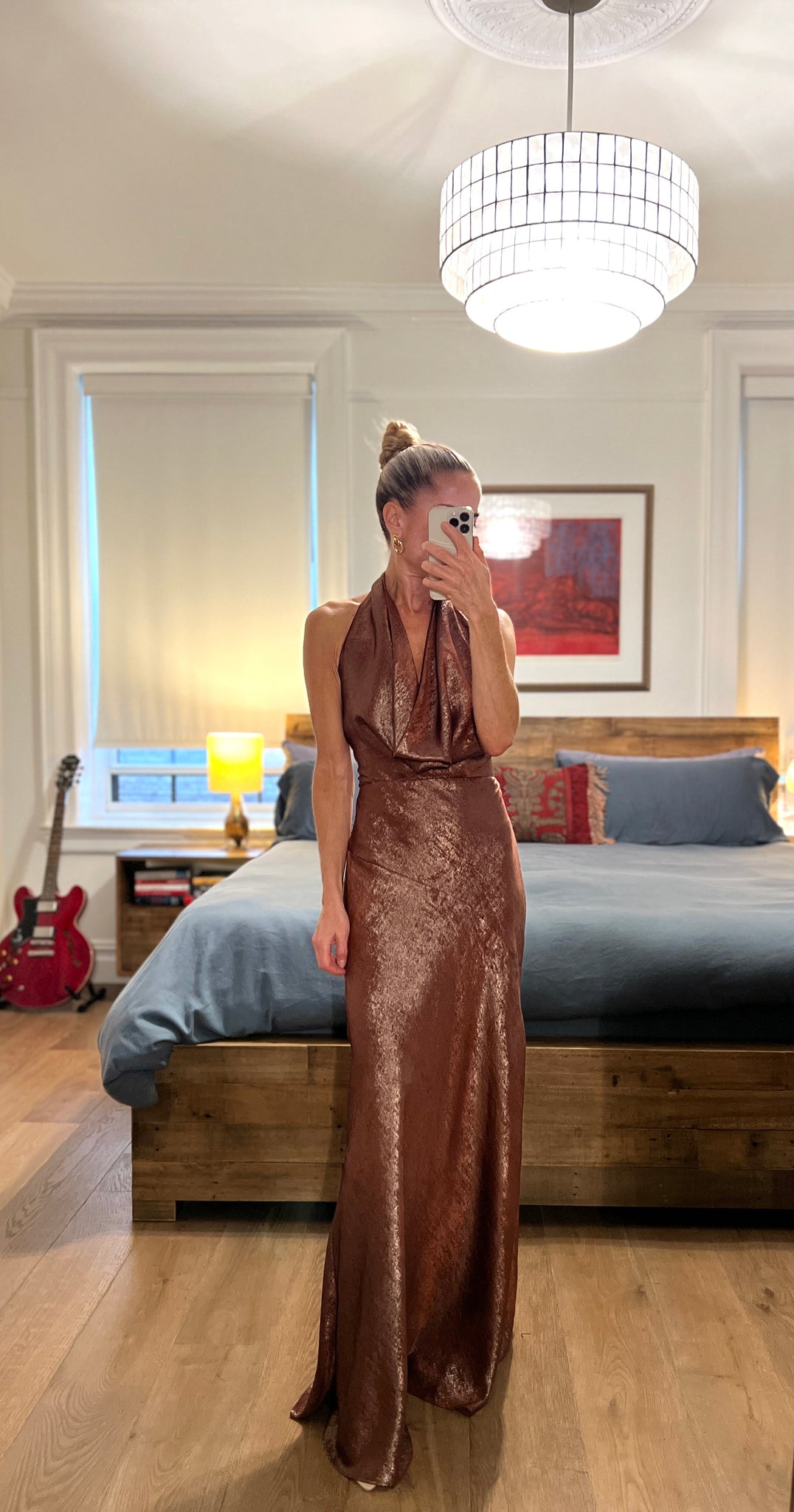 liquid satin cowl midi dress