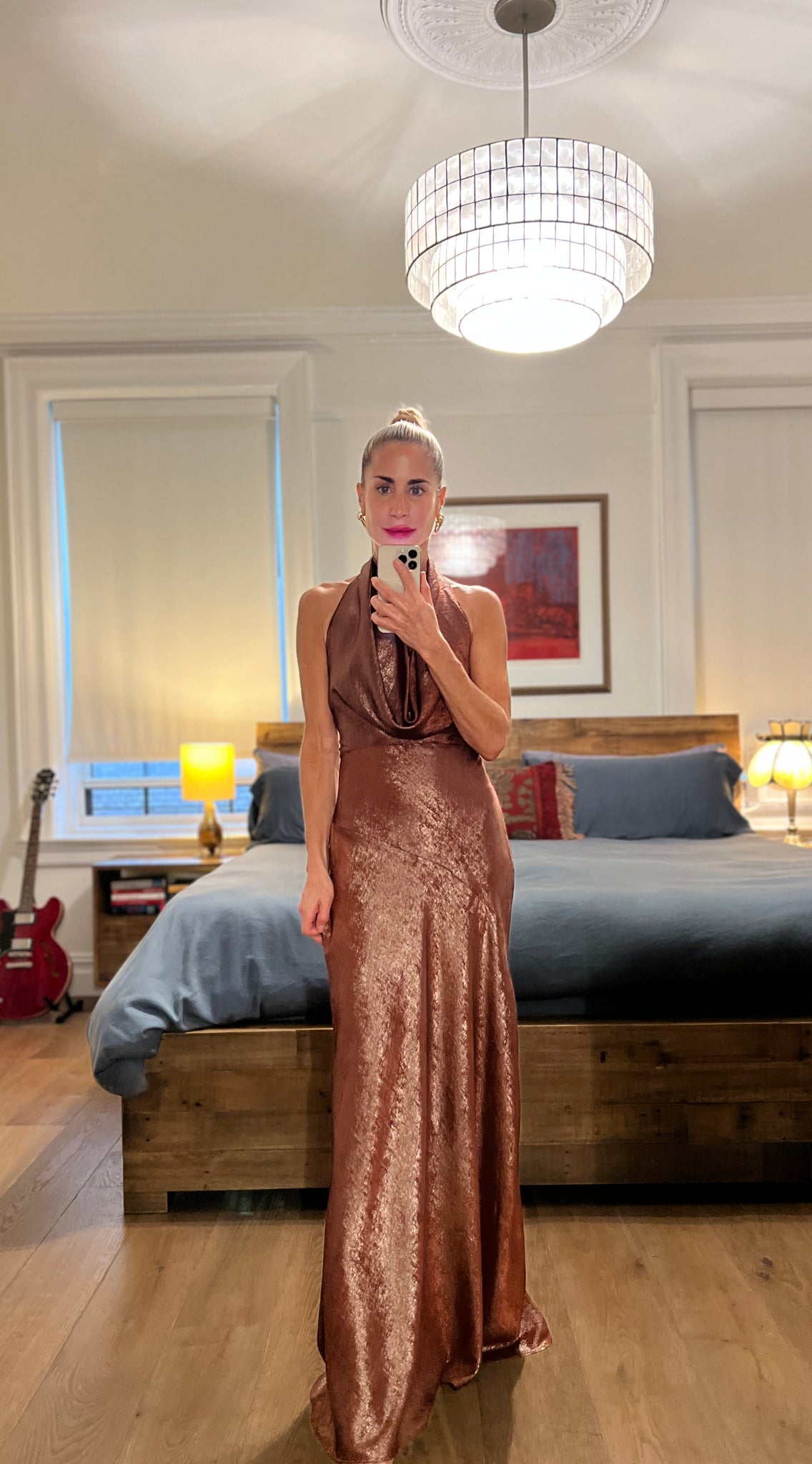 liquid satin cowl midi dress - sunset